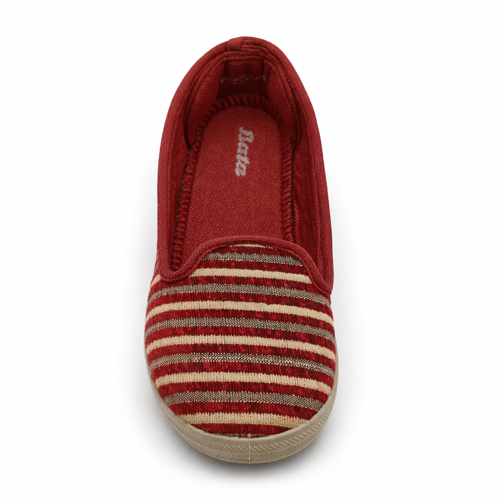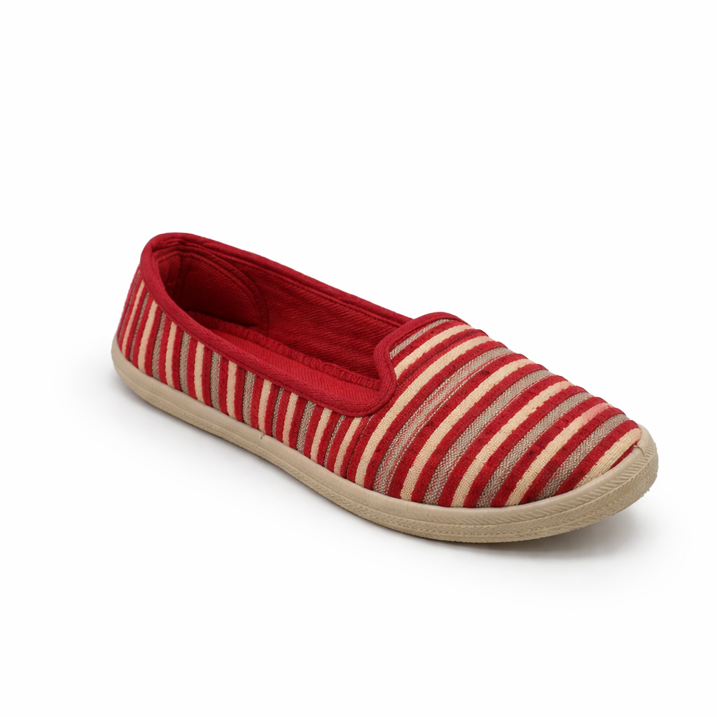 These stylish slip on pumps feature a soft fabric upper with classic striped detailing, giving them a simple yet elegant look. Designed for everyday comfort, they offer a lightweight feel and an easy slip on fit. The cushioned insole and flexible sole provide comfort for daily wear, making them ideal for casual outings, work, or home use. Finished in a rich red tone, these pumps pair effortlessly with both traditional and casual outfits.