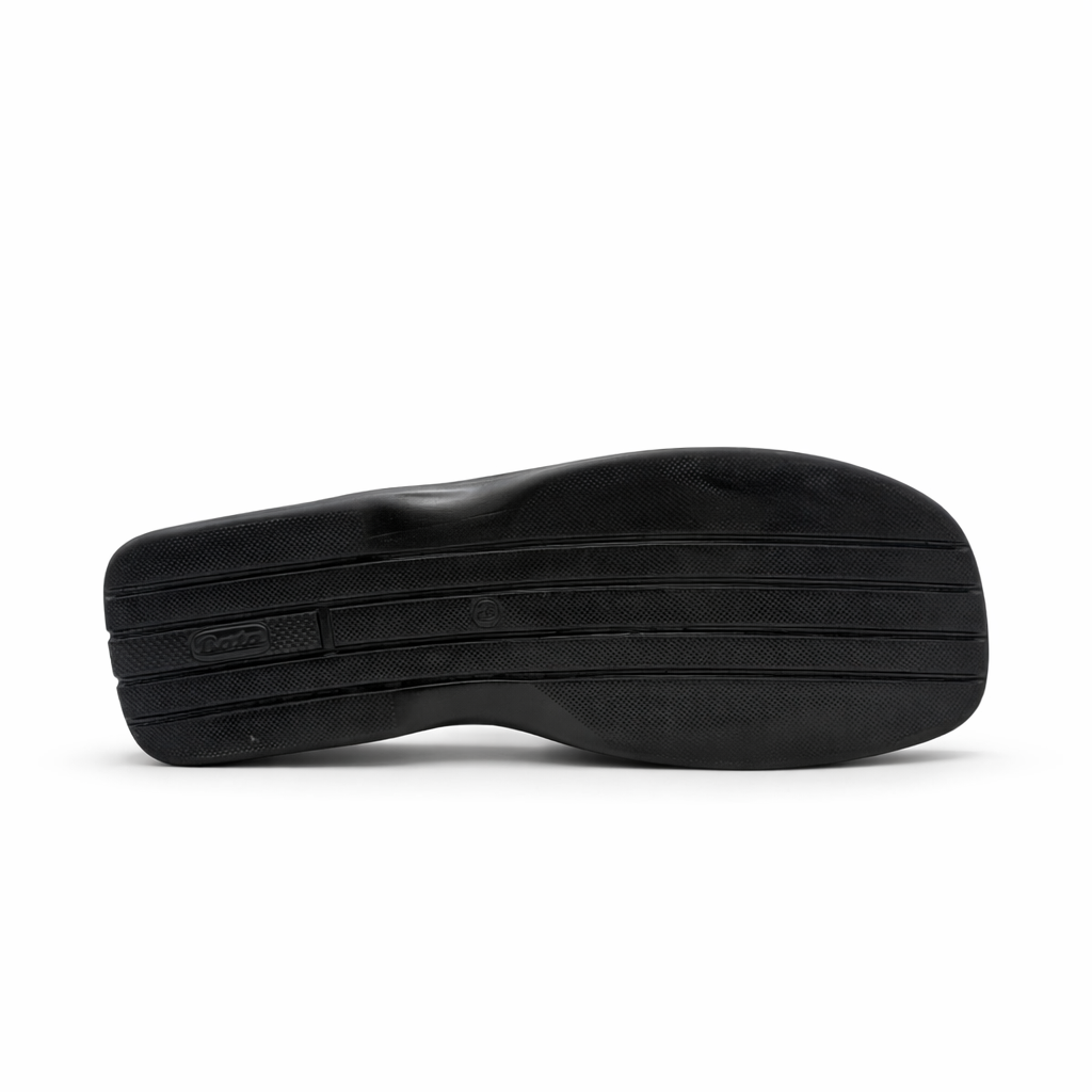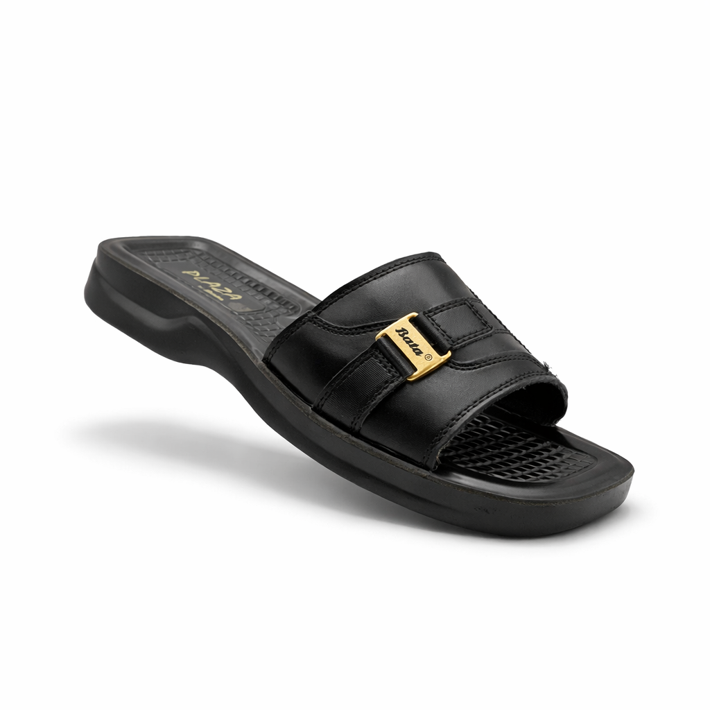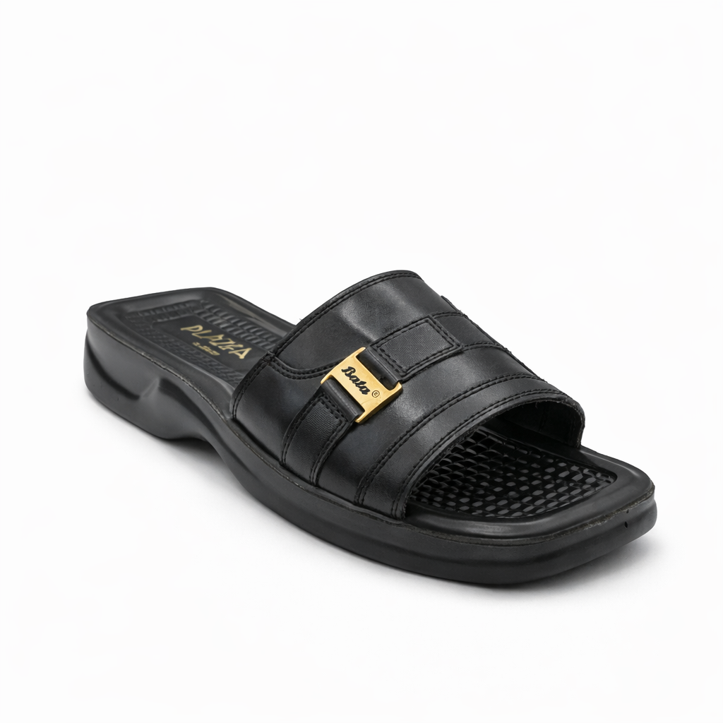 This men’s casual slide slipper is designed for everyday comfort with a clean and modern look. It features a smooth black upper with a double strap design and a subtle metallic logo detail for added style. The cushioned, textured footbed provides better grip and comfort during walking. A supportive, slightly elevated sole helps reduce foot strain and offers stability. Easy to slip on and lightweight, this slipper is ideal for daily wear, home use, and casual outings.