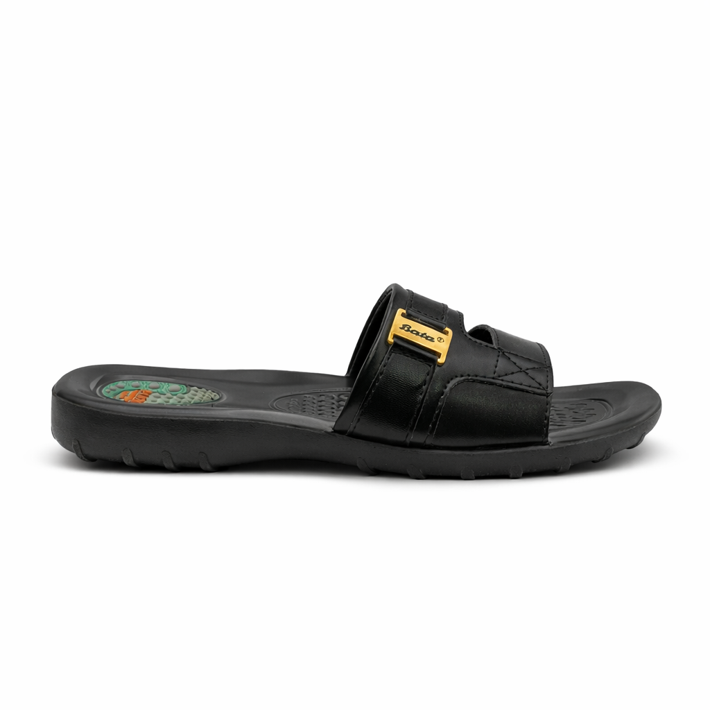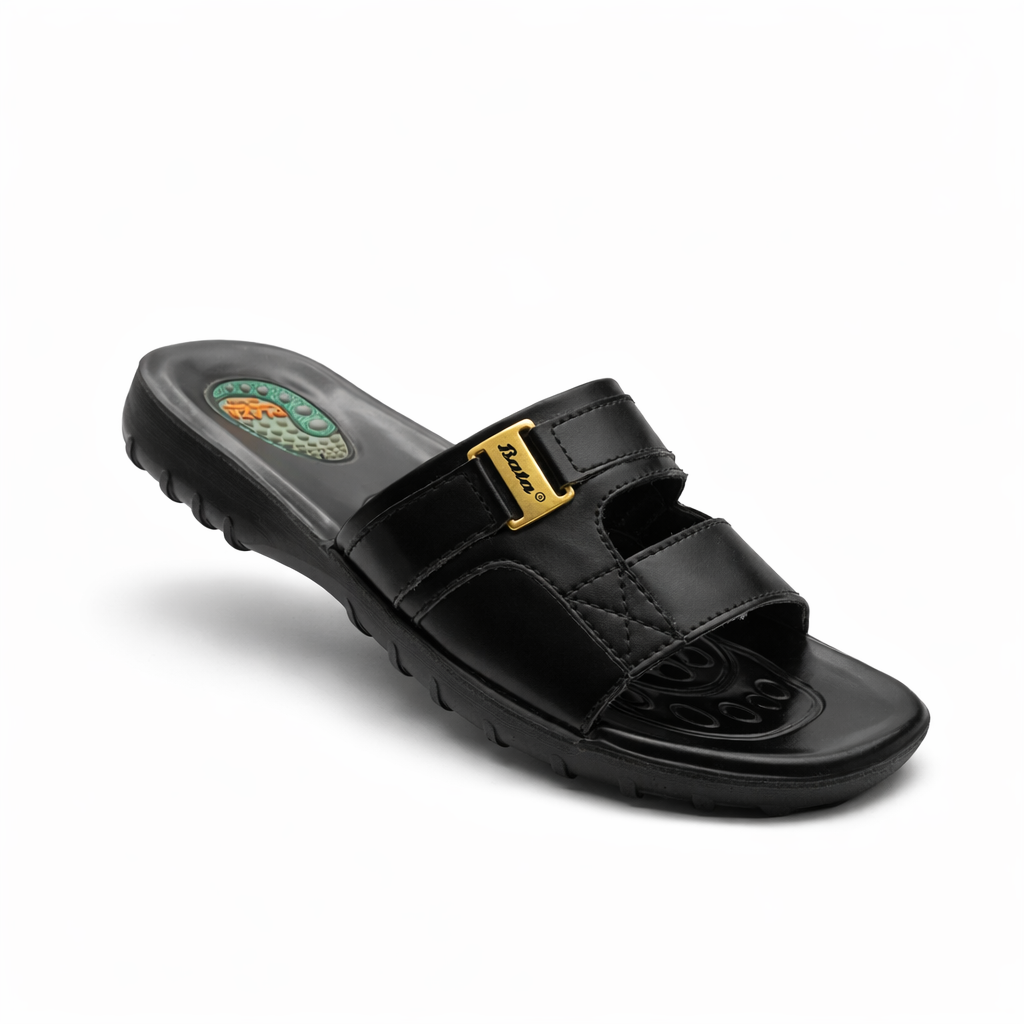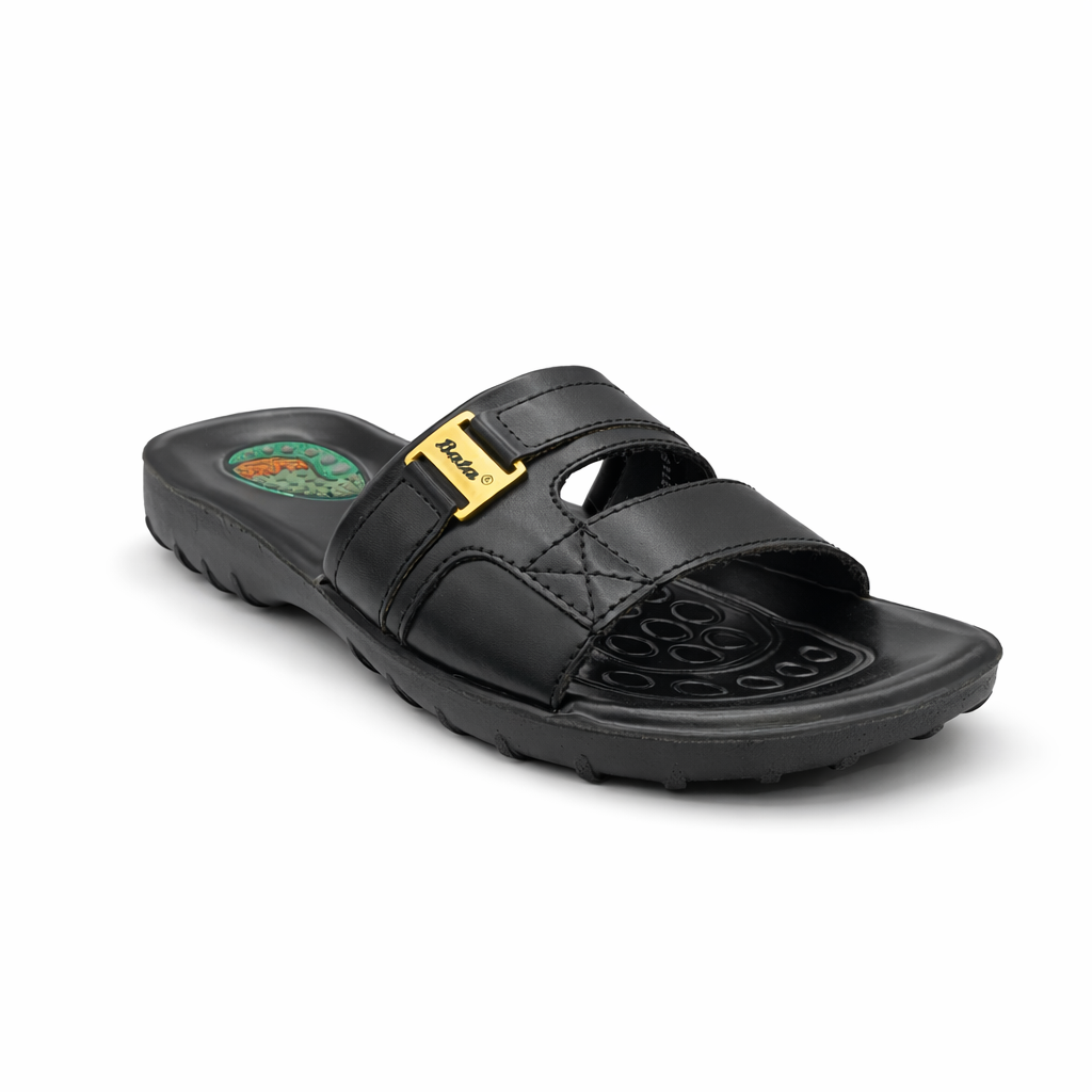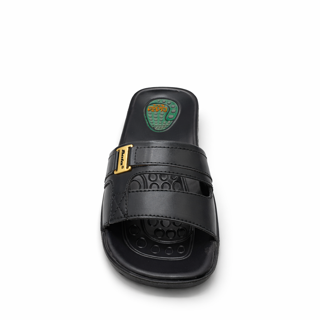 This men’s casual slide slipper is designed for comfort and everyday use. It features a smooth black upper with a secure strap design that provides a comfortable fit. The cushioned footbed includes a textured surface for better grip and support while walking. Its lightweight yet durable sole helps absorb impact, making it suitable for regular wear. Easy to slip on and off, this slipper is ideal for home use, casual outings, and light outdoor activities. The simple and modern design ensures long lasting comfort and a neat, practical look.