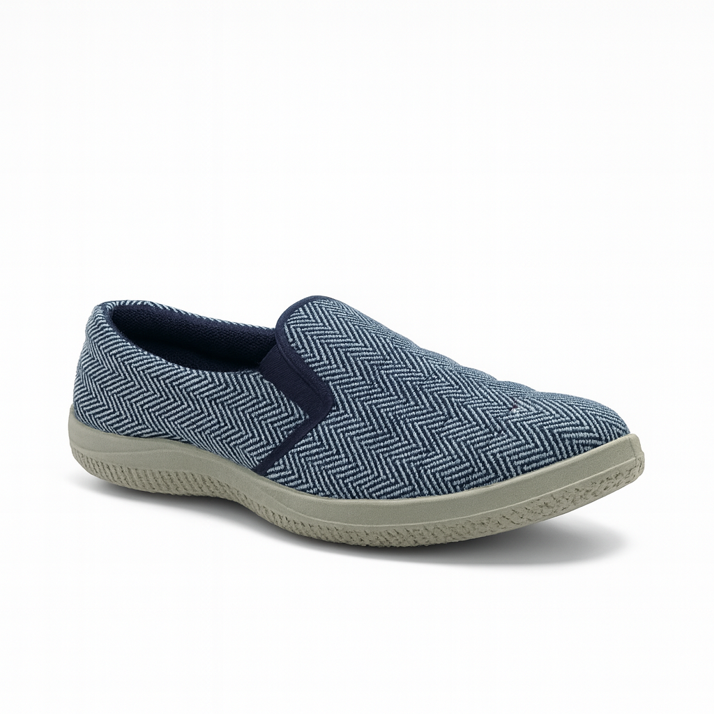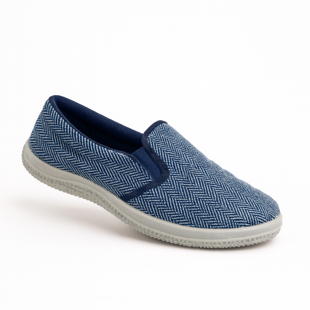 Step into everyday comfort with these stylish blue slip-on shoes designed with a modern herringbone pattern. The breathable fabric upper keeps your feet cool, while the cushioned inner lining ensures a soft and comfortable feel throughout the day. Elastic side inserts allow for an easy slip-on fit, making them perfect for quick outings and casual wear. The lightweight, shock absorbing sole provides a stable grip, ideal for walking and daily use. A versatile choice that pairs effortlessly with jeans, chinos, and casual outfits.