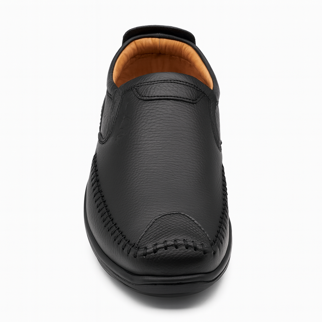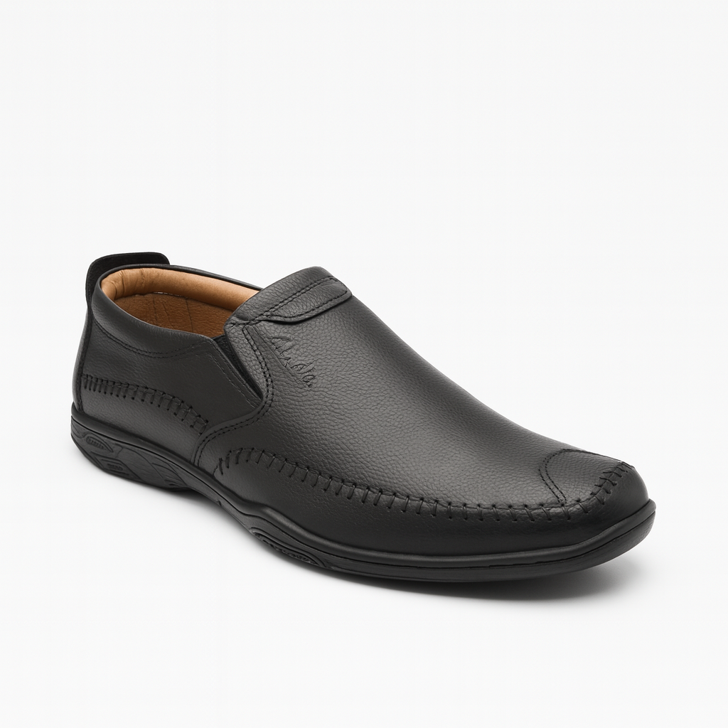 This elegant slip on shoe is designed for all day comfort and effortless style. Crafted from high quality textured leather, it features a soft tan inner lining that enhances breathability and cushioning. The hand stitched detailing along the upper adds a refined touch, giving the shoe a premium and durable finish. Its flexible rubber sole ensures smooth movement and reliable grip, making it suitable for daily wear, office use, and casual outings. The elastic side panels allow easy on and off, offering a snug and comfortable fit.