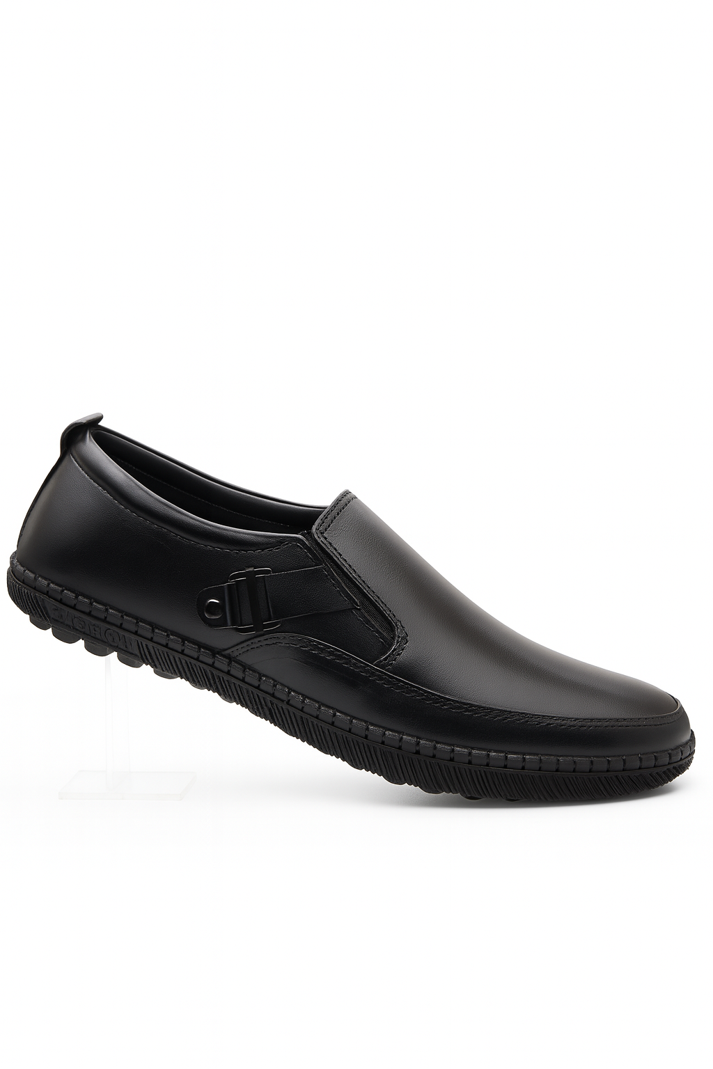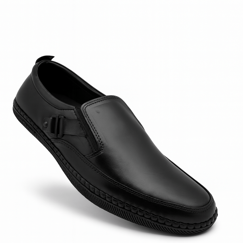 This premium  slip-on shoe combines modern style with everyday comfort. Made from smooth, high-quality synthetic leather, it offers a refined and polished look suitable for casual outings and smart everyday wear. The shoe features a soft cushioned inner lining for superior comfort and a flexible rubber sole that ensures steady grip and durability. The side buckle-style detailing adds a unique, stylish touch, while the stitched edges enhance durability and craftsmanship. Designed for effortless wear, this slip-on is perfect for those who want comfort and style in one elegant pair.