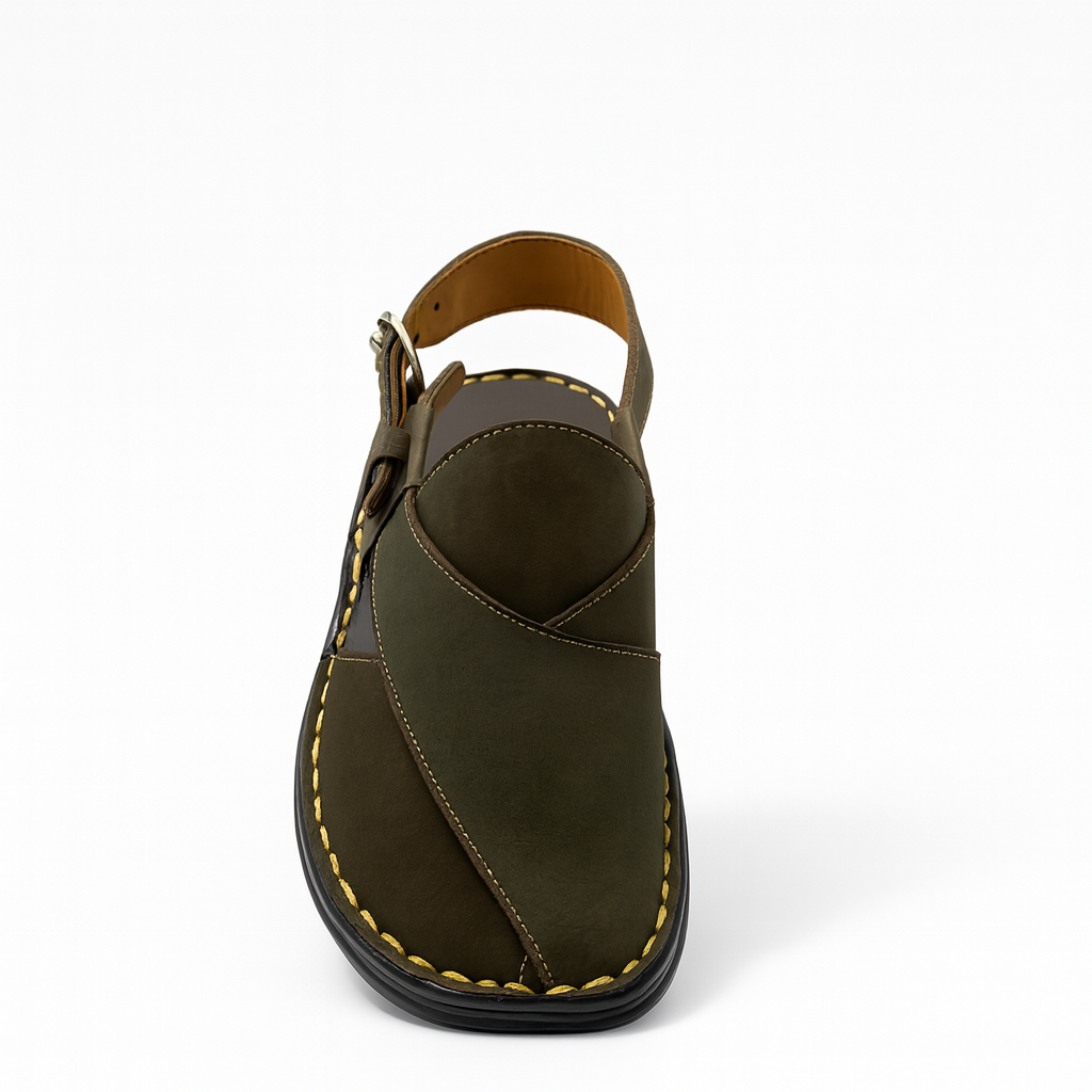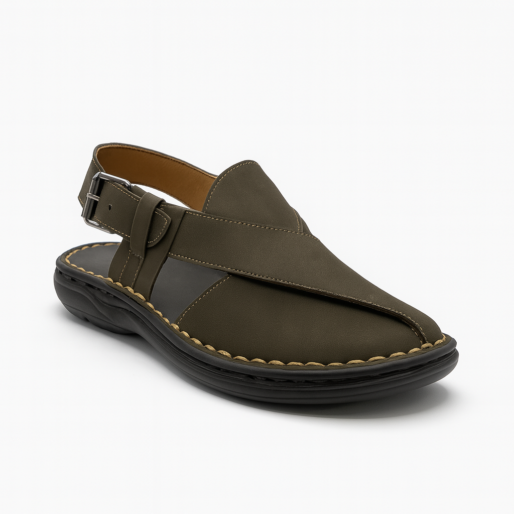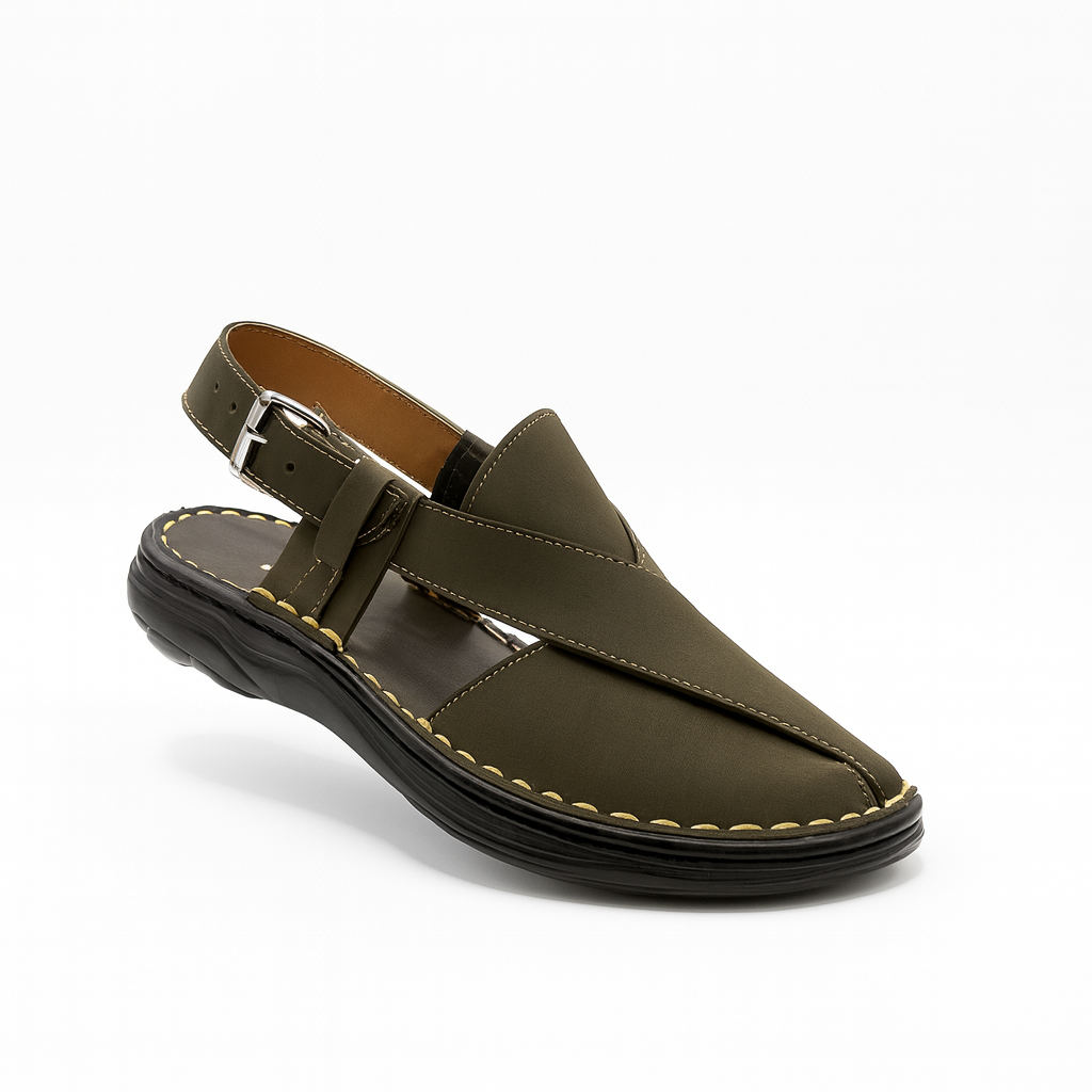 This  men’s sandal offers a perfect combination of comfort, durability, and traditional style. Crafted from high quality synthetic leather, it features a sleek cross-strap design that provides secure coverage while maintaining a stylish look. The upper has neat contrast stitching that adds a refined finish to the overall design.