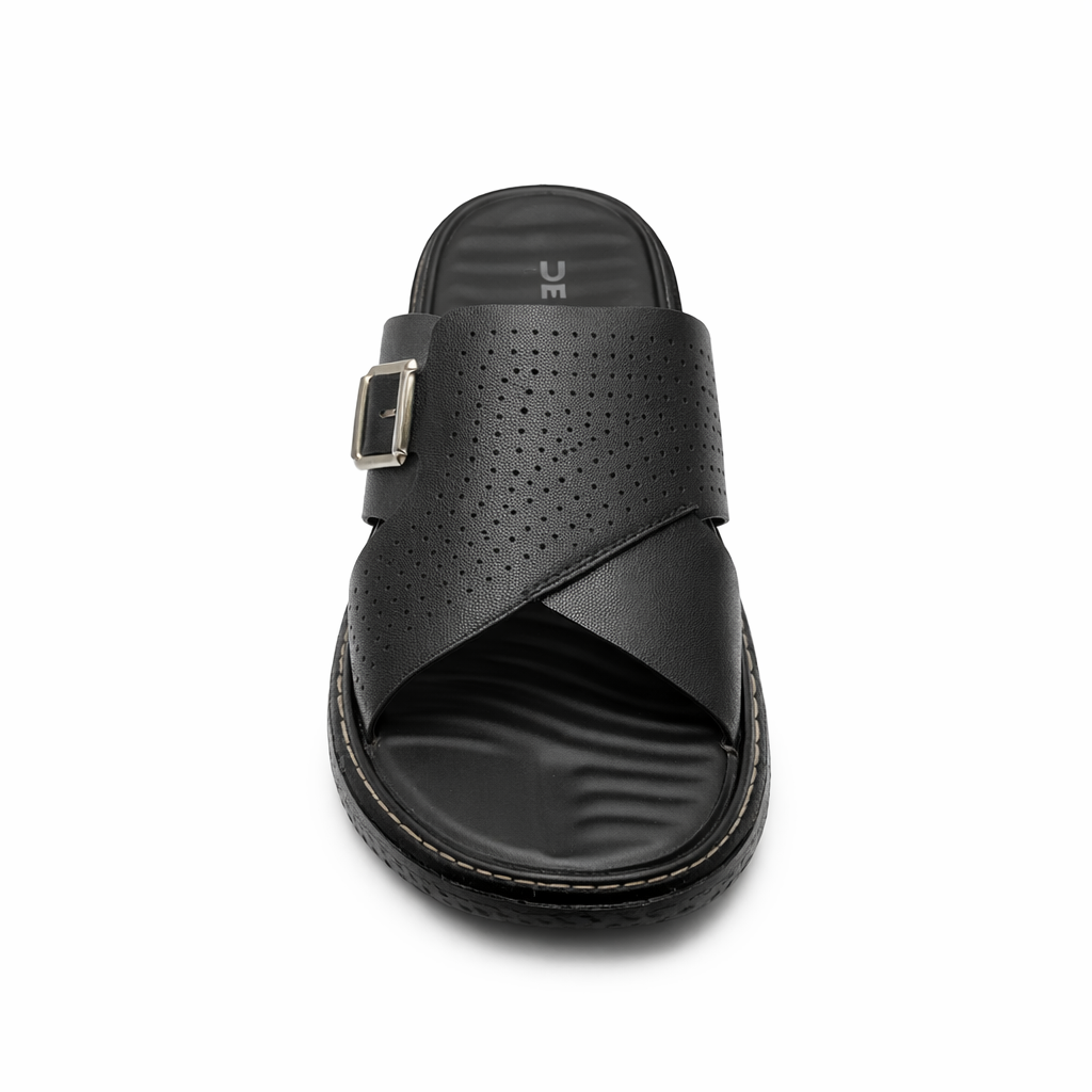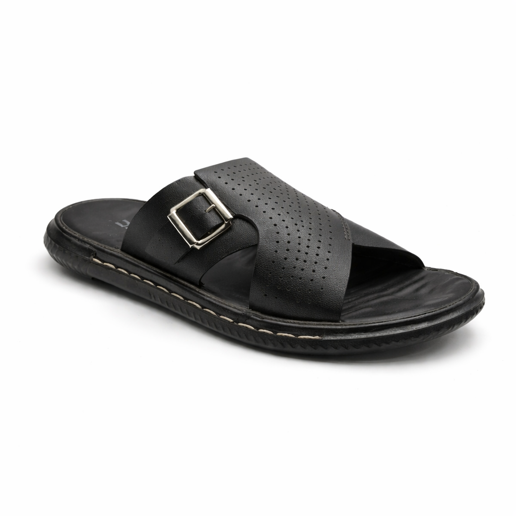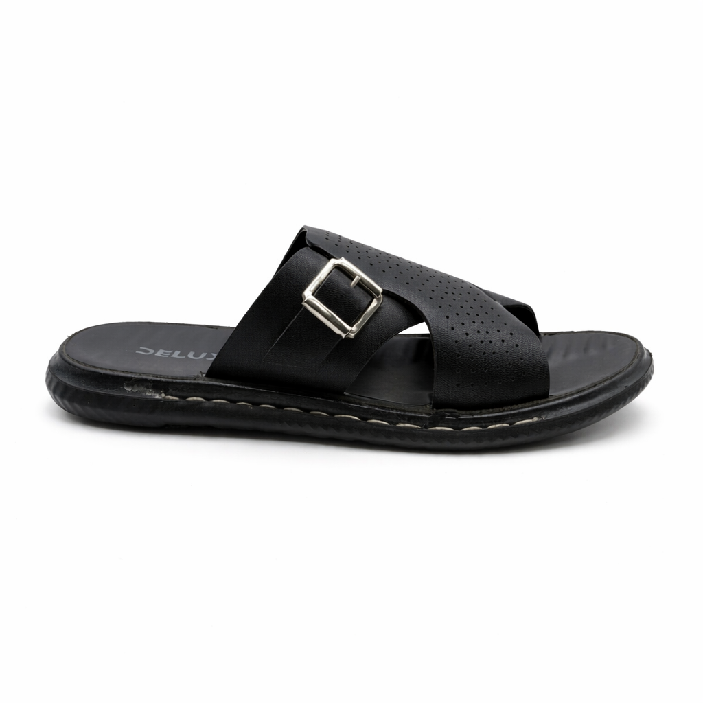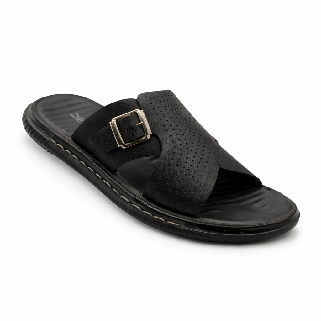 This black slip on slipper is designed for everyday comfort and casual style. Made with a soft, durable synthetic leather upper, it features a cross strap design with fine perforation details that enhance breathability and visual appeal. The adjustable metal buckle allows for a secure and personalised fit.