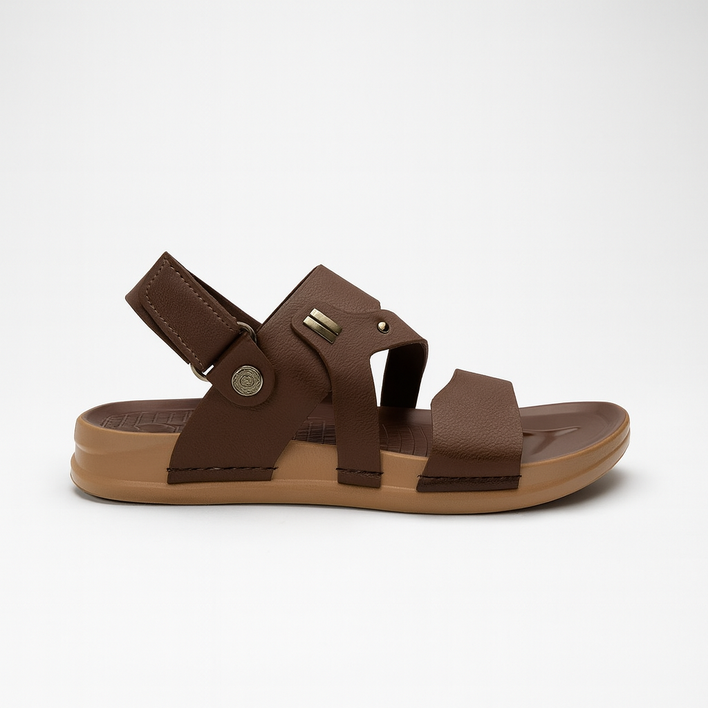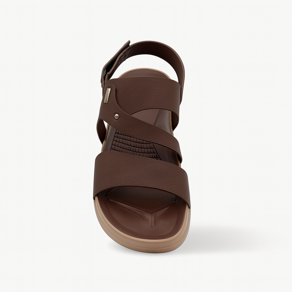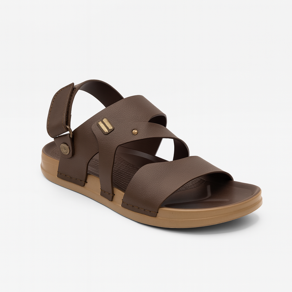 This men’s comfort sandal is designed with a modern cross strap style, offering a perfect blend of casual fashion and everyday ease. The upper is crafted from high quality synthetic leather with a lightly textured finish, giving it a premium and durable look. The straps are arranged in a stylish overlapping pattern that provides both support and breathability.